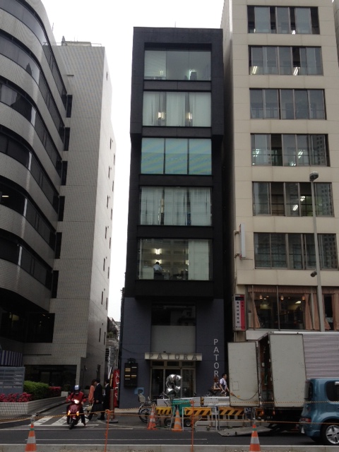 中央の黒いビルの8階が受付です