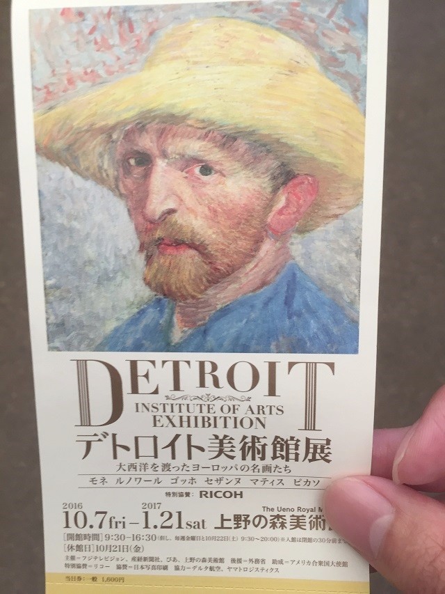 芸術の秋ということで上野の森美術館で行われている「デトロイト美術館展」に行ってきました。今回は印象派~ポスト印象派、20世紀のドイツ、フランスと4つのテーマに別れており、ひまわりで有名な「ゴッホ」や水練で有名な「モネ」20世紀の巨匠「ピカソ」などの作品が展示されています。