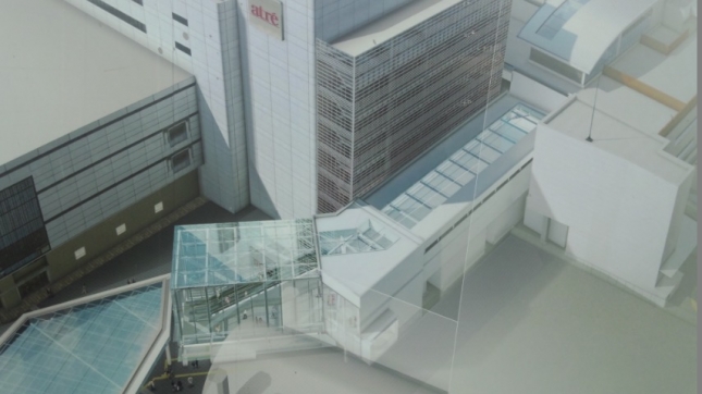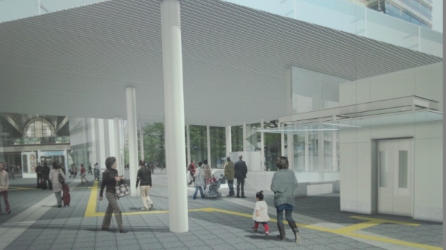 右側には既存の駅ビルがあり、左側にはオフィスビルが建っています。