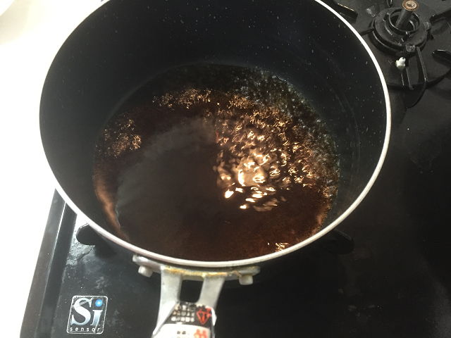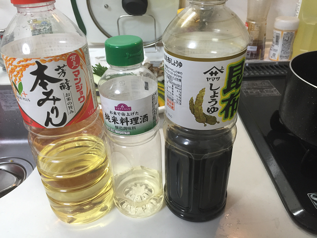 醤油、酒、みりん、水を1:1:1:4の割合で鍋に入れて火にかけます