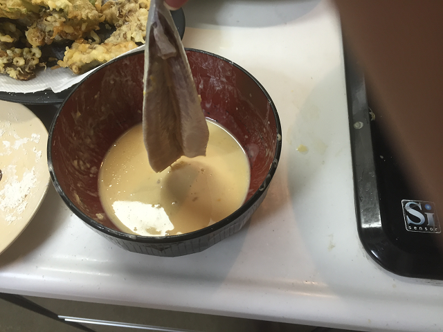 しっかりと水分を切った食材で衣をつけます