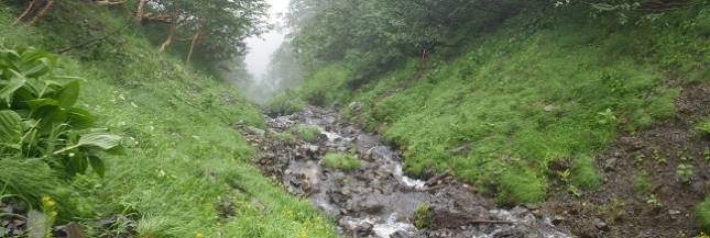 山道は 一日中の雨のせいなのか元々なのか 数々小川で 阻まれていて 、