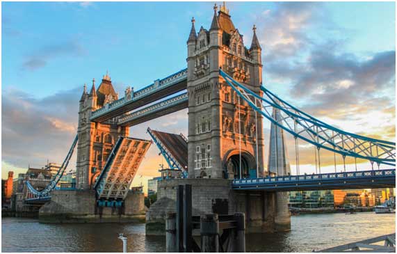タワーブリッジはロンドンの中心地東側(イーストエンド・オブ・ロンドン)の更なる発展の為に、1886年に着工、1894年に完成した。建設にあたり、交易等を行うを大型の外洋船の通行を遮断しないよう跳ね橋とされた。一時は一日に何十回も開閉していたが、現在は週に4~5回船の航行にあわせて開閉している。タワー上部には歩道橋が設けられおり、通行することが可能。