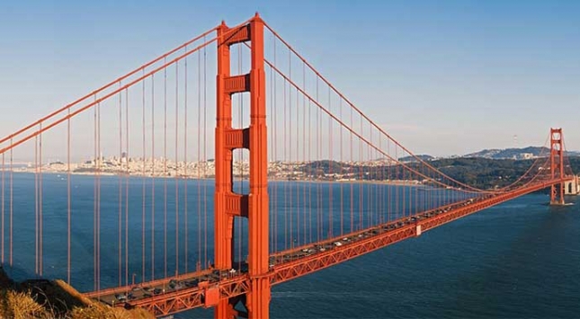 ゴールデンゲートブリッジは、サンフランシスコ湾と太平洋を結ぶ幅1マイルの海峡に架かる橋で、全長2737mあり、橋の中央の高さは67mの非常に大きな吊り橋です。この橋はサンフランシスコ半島の北端にあるサンフランシスコと、その対岸のマリン群を繋いでいます。1937年に開通したこの橋は、1964年まで吊り橋としては世界最長を誇っていました。