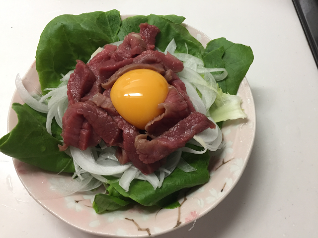 ③野菜の上に馬刺しを細切りにして、卵を乗せて完成です