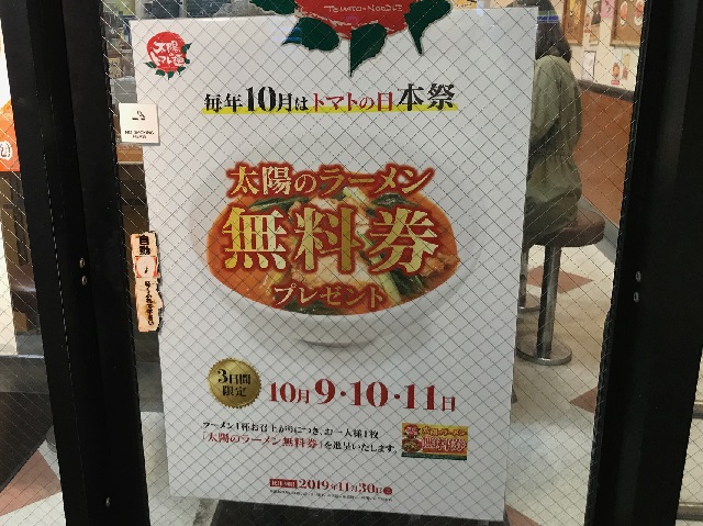 ご来店してラーメン一杯で太陽のラーメン無料券配布中 。