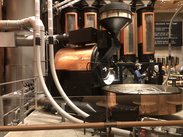 また店舗の中心に位置する大きな焙煎機械も見ごたえ十分です。